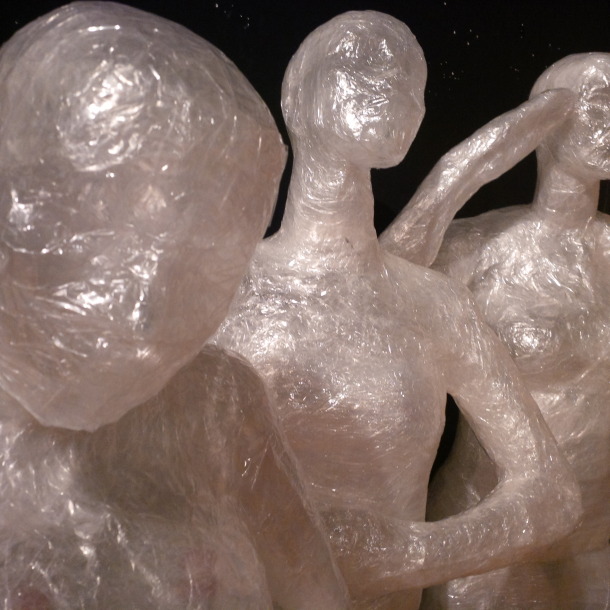 For those of you interested in the technical side of things, a lot of hard work and many hours went into the making of “In Love and War”. The installation consisted of 5 life size sculptures made entirely of packing tape wrapped onto real life models, then removed and reassembled. (Approximately 5 rolls per sculpture). The bases are constructed from wood and 4 foot metal posts. Each sculpture had to be fitted with appropriate WWII attire that suited it’s subject’s story, these were scouted from various local thrift shops. The “dock and water” aspect of the project was probably the most challenging part. This required precise measurements and construction. Two 12ft wooden posts were cut into 1 and 2 foot lengths to represent dock posts and to connect the framework of pvc piping that would support 2 large blue tarps (cut into strips to allow airflow) meant to represent the ocean. There were MANY obstacles to overcome during the set up of this contraption. Not the least of which was a forceful wind! But in the end, it turned out beautifully and had a very elegant and regal effect.
